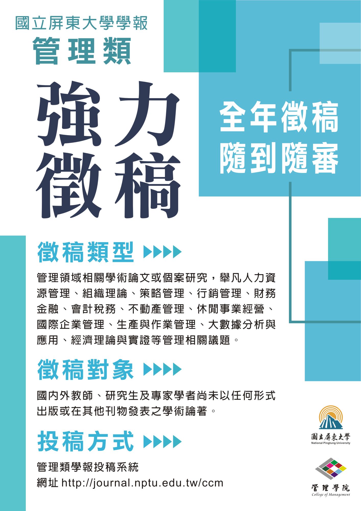 二、徵稿對象為國內外教師、研究生及專家學者尚未以任何形式出版或在其他刊物發表之學術論著。全年接受投稿,歡迎惠賜有關管理領域相關論文,每年12月出版一期。