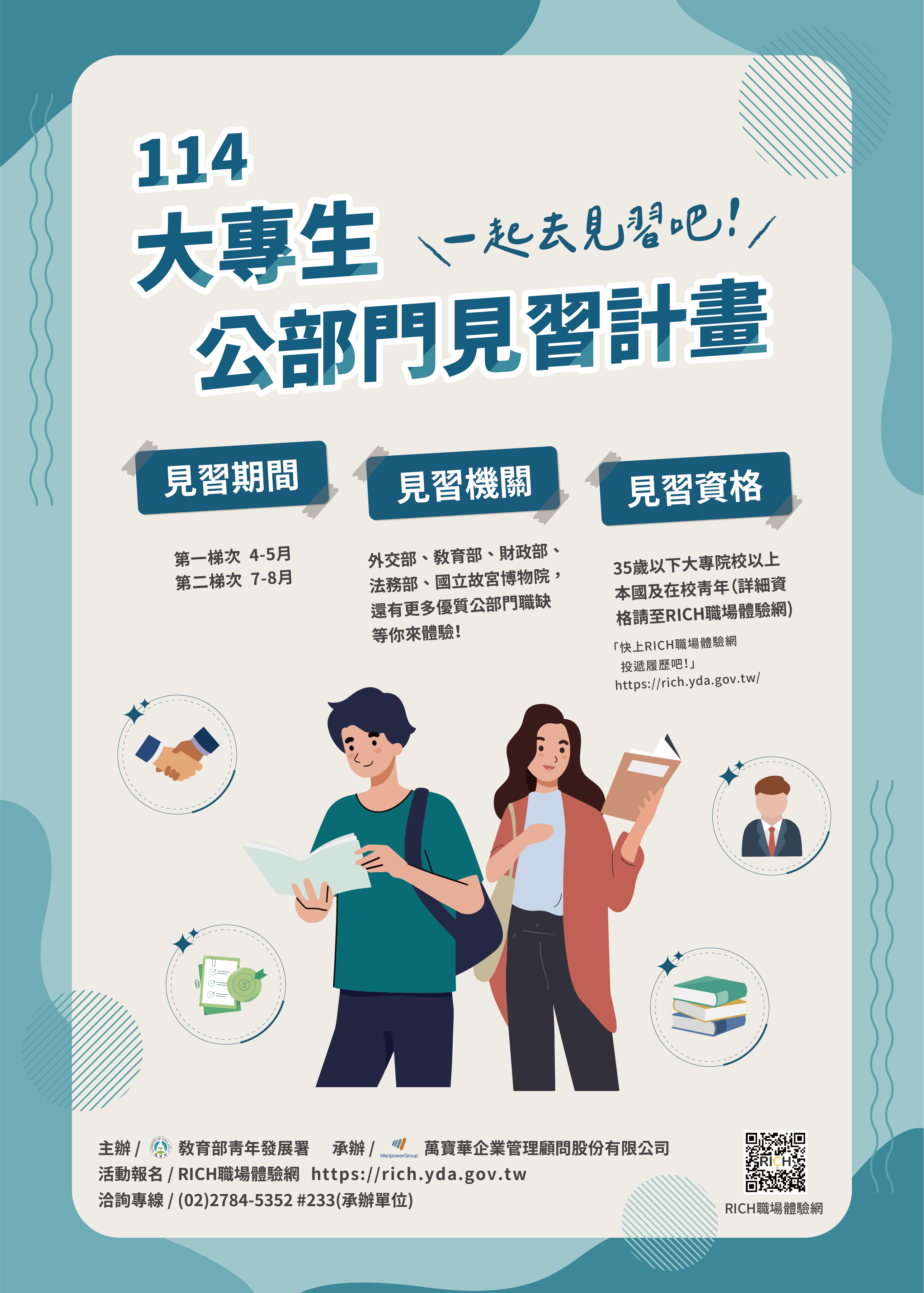 教育部青年發展署為協助大專在學青年及早認識職場,培養就業能力,同時累積工作經驗,辦理大專生公部門見習計畫,期透過公部門提供的見習機會,讓大專在學青年接觸公部門,了解公部門的行政運作和工作內容,學習職場上應有的規範及工作態度,為自己未來的職涯發展累積更多的就業能量與競爭力。