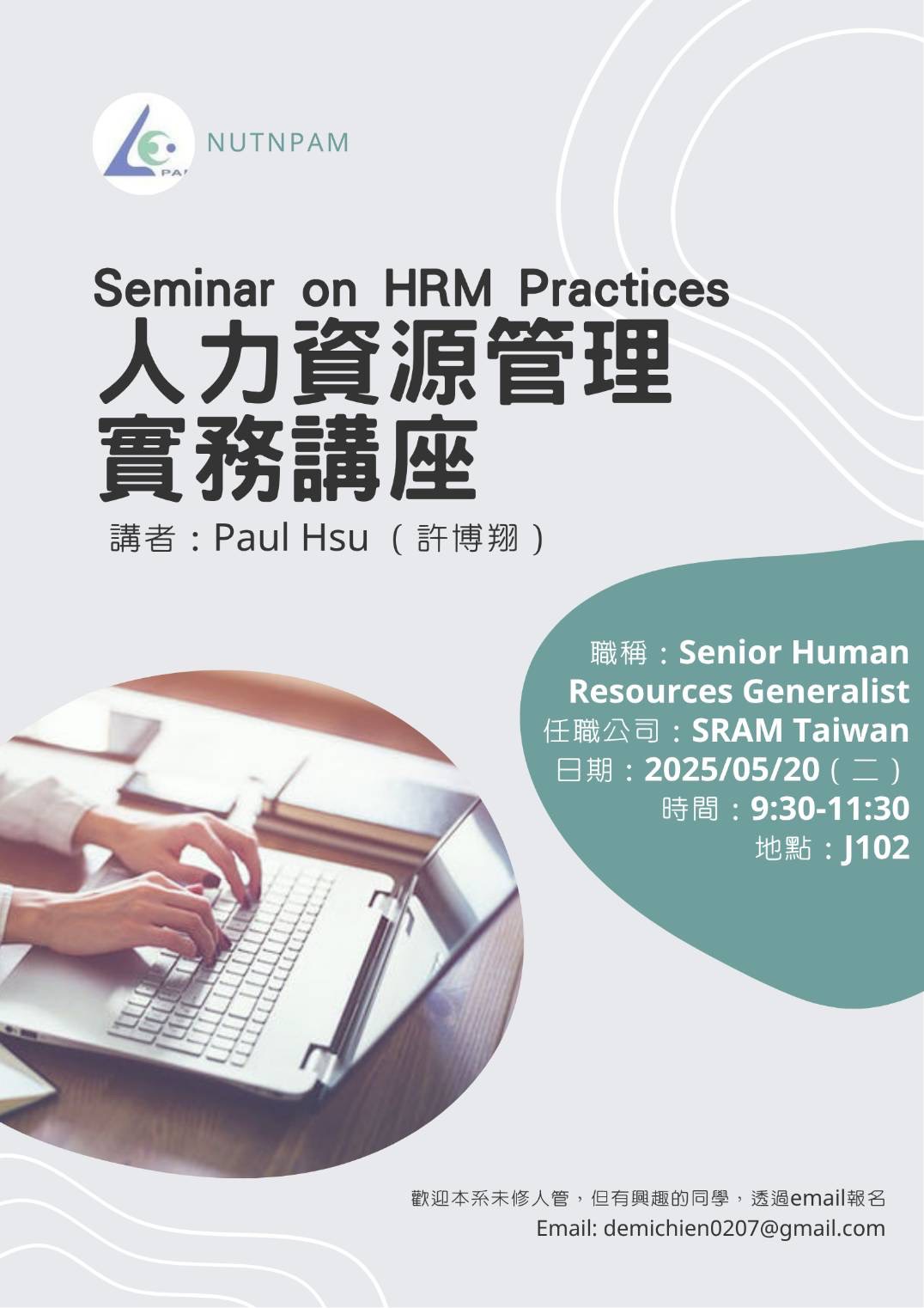 人力資源管理實務講座 主講人:許博翔(Senior Human Resources Generalist) 活動時間:114年5月20日(二)9:30-11:30 活動地點:文薈樓J102